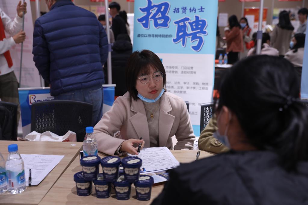 招聘会现场,各企业通过海报、单页等形式进行宣传,同学们在志愿者的引导下走到各企业的展位前,递交简历,并进行现场面试。在企业工作人员的讲解下,同学们了解到了心仪企业的发展方向、岗位需求、招聘人才要求等信息。除毕业生外,其他年级的学生也来到现场感受求职氛围,提前了解就业形势,现场气氛十分活跃。