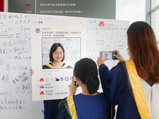 特别定制“朋友圈”和“学生证”两种样式展板供毕业生选择,为毕业生们提供别样的“拍照圣地”。手持展板吸引诸多毕业生们留下属于自己的独家毕业记忆。