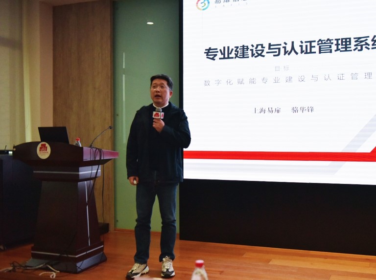 接着,骆华锋作了题为《数字化赋能专业建设与认证管理》的讲座。他围绕工程教育专业认证的三大核心理念,详细介绍了如何建立日常教学协同工作平台,实现专业建设与认证过程中的教学文档电子化管理。他认为,数字化技术可以极大地提高教学管理的效率和质量,让教师从简单重复的工作中解放出来,回归教学工作本身,更加关注学生的产出。他还表示,信息化技术已经成为学校专业建设的数据基础和支撑工具,对于提升专业建设水平和人才培养质量具有重要意义。