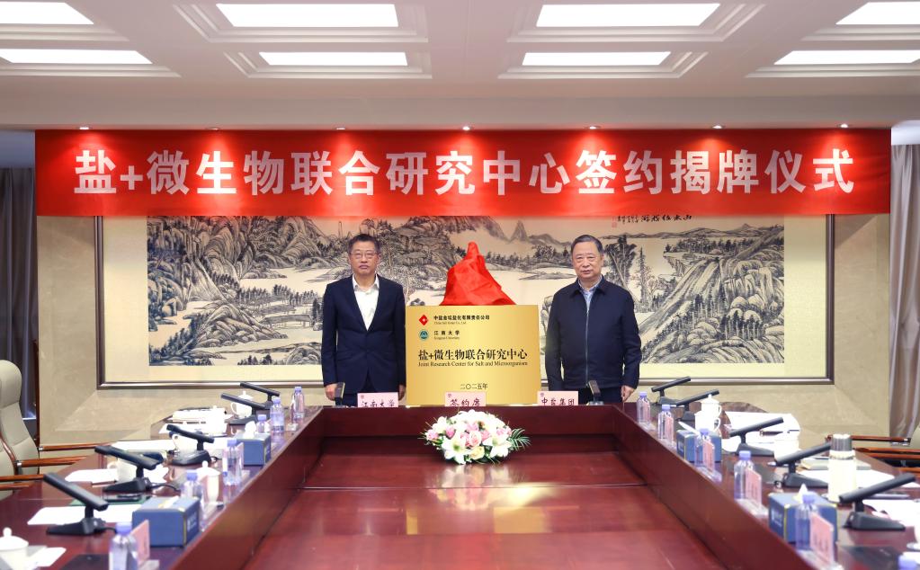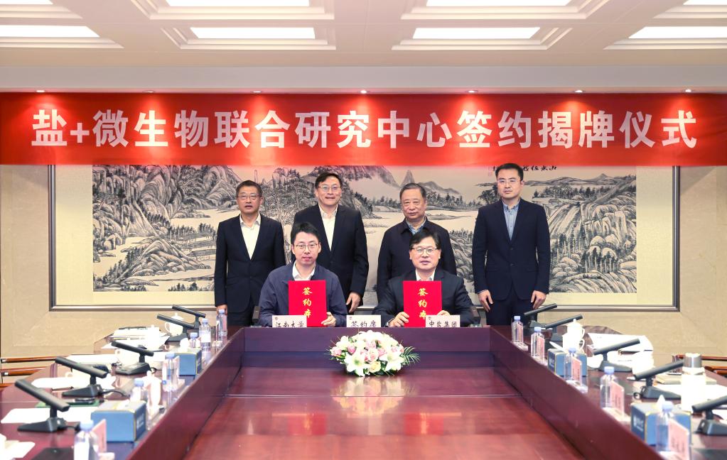 在与会嘉宾的共同见证下,中盐金坛公司总经理钮永涛与我校食品科学与资源挖掘全国重点实验室常务副主任翟齐啸教授代表双方签署合作协议,李耀强与陈卫共同为“盐+微生物联合研究中心”揭牌。