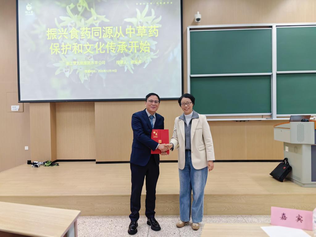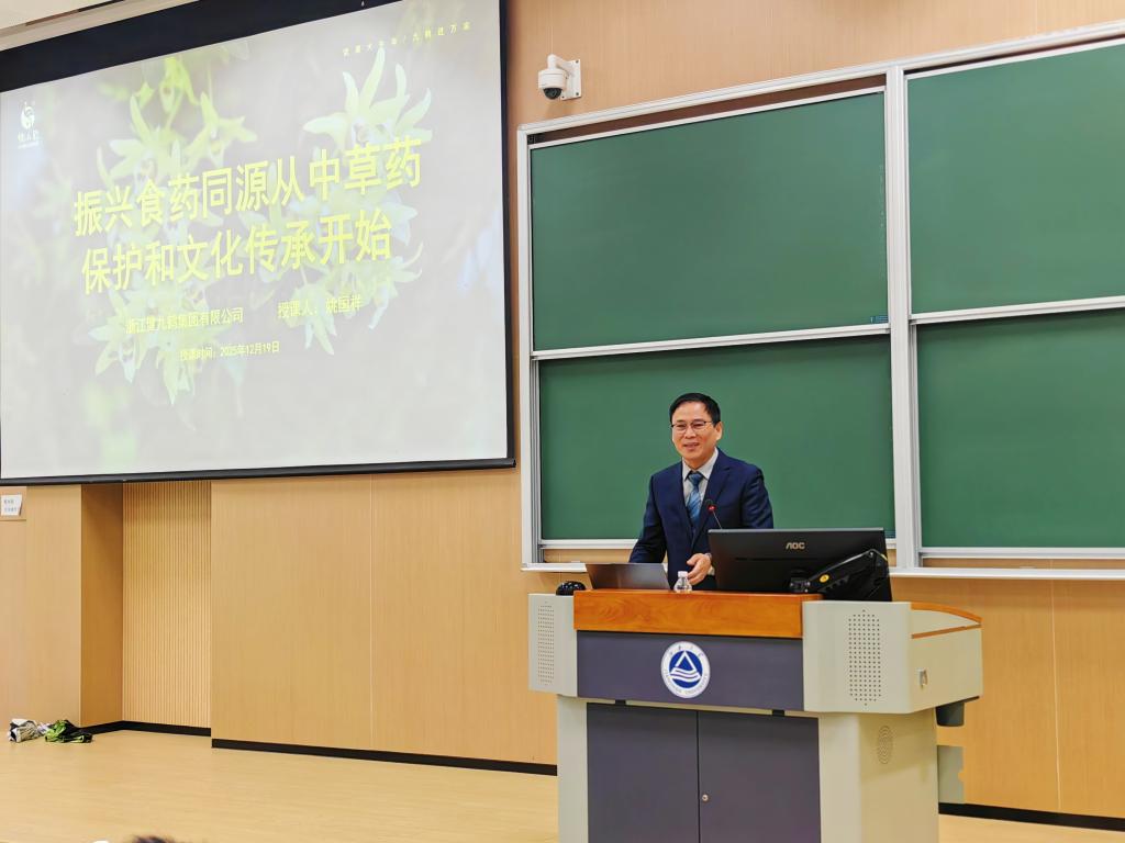 《食品产业导论》系列讲座迎来第五讲。本次课程特邀浙江健九鹤集团有限公司董事长姚国祥先生,为师生带来了一场兼具产业洞察与人文情怀的精彩报告。姚国祥先生不仅是企业家,更担任多项社会职务,是宁波市劳动模范、余姚市社科联副主席,同时也是第七批宁波市非物质文化遗产“余姚铁皮石斛炮制技艺代表”传承人,持续推动铁皮石斛产业发展与文化保护。