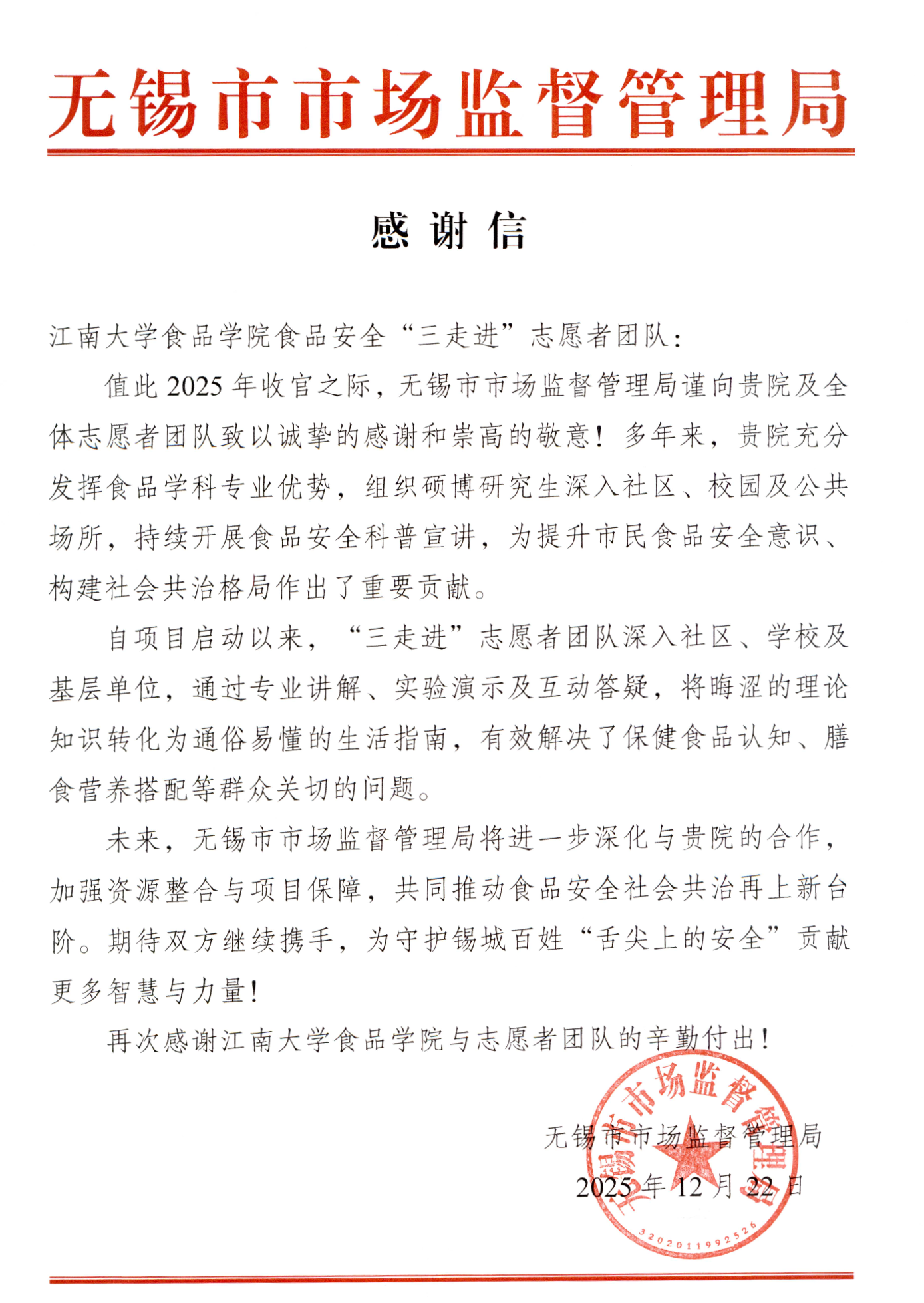 团队与无锡市市场监督管理局长期以来保持着紧密的合作关系。近日,市局特别向学院及全体志愿者团队发来感谢信,对双方在食品安全社会共治方面的协作成果给予充分肯定。感谢信是对我们双方携手服务社会、共建食安防线工作的生动注脚,也为未来的合作注入了更强的信心。展望新征程,希望麻豆tv