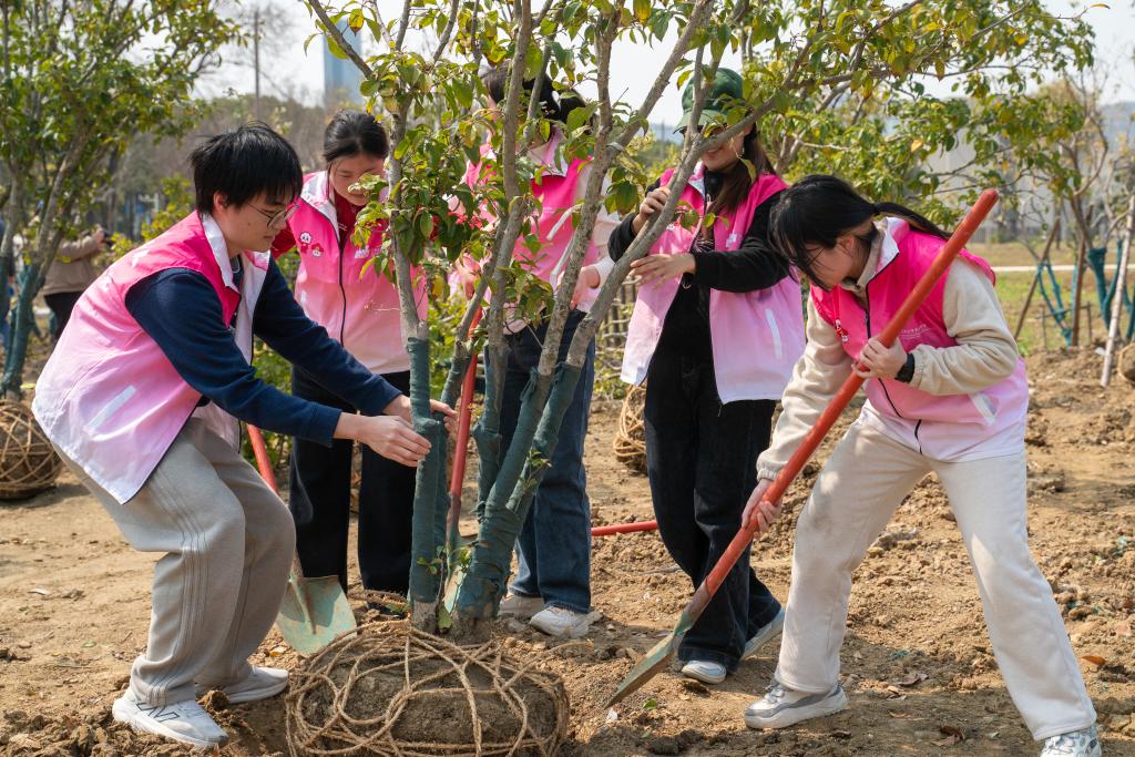 一株树苗,一份希望;一片绿意,一种担当。活动正式开始前,曹沛号召大家在集体劳动中激发热情、增进协作。活动现场,师生们热情高涨、分工协作,挖坑、扶苗、填土、浇水,每一个步骤都认真细致、有条不紊。环境中心的老师全程悉心指导,从挥锹挖坑到提桶浇水,每一个环节都仔细查看、耐心讲解、亲身示范。指尖沾染泥土,心中盛满期待,大家亲手栽种下一棵棵树苗,细心填埋土壤,浇灌生命之水,动作间满是对绿色的向往、对自然的敬畏。而额头渗出的汗珠,折射着春日的暖阳,也映照出食品人守护生态的赤诚之心。